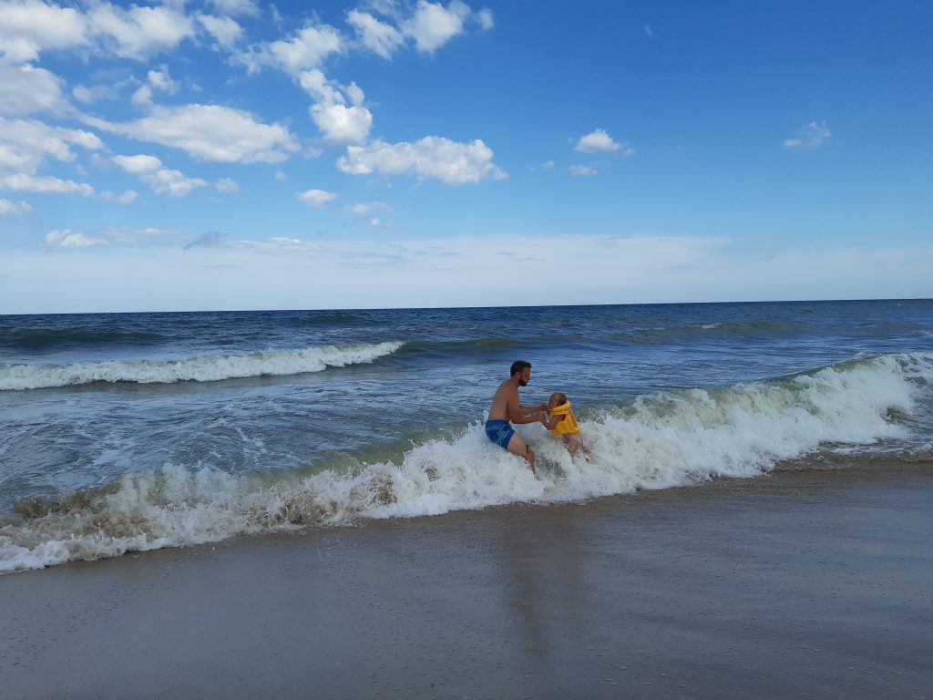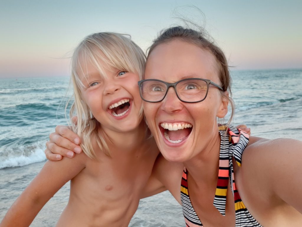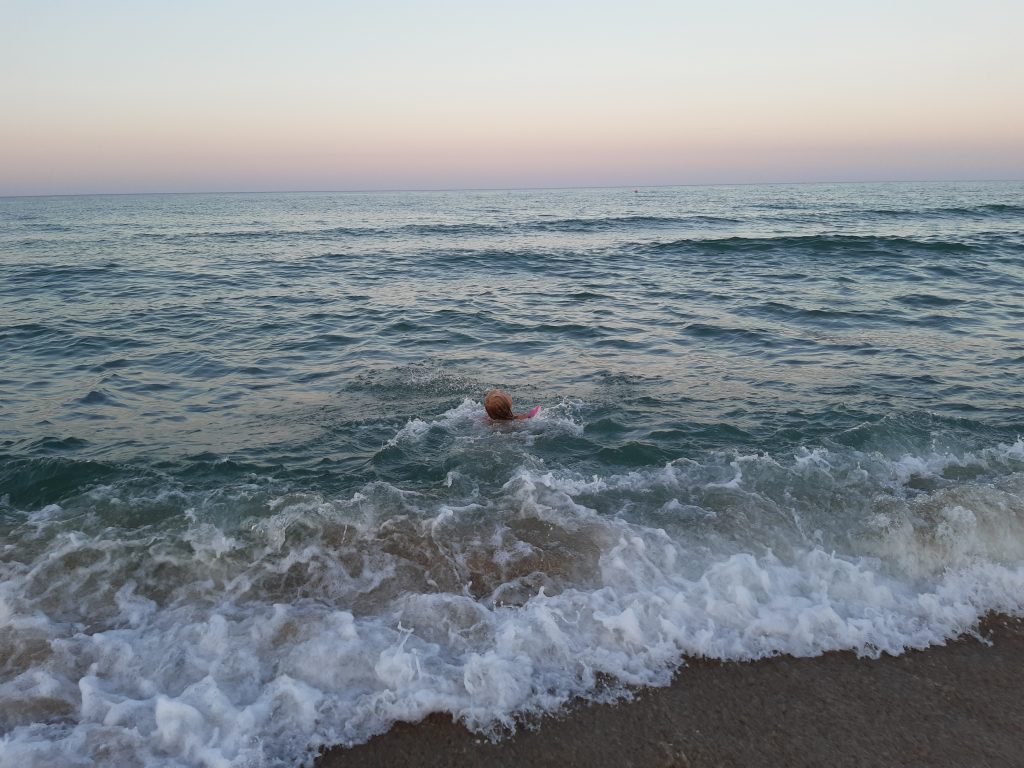 Wir freuen uns gerade darüber auch dieses Urlaubsflair mal ein paar Tage beobachten zu dürfen und sind dankbar, das wir zum Weiterfahren „gezwungen“ wurden. Natürlich sind hier wieder viele, viele Menschen und wenn ich an den Strand komme und quasi keinen Sand mehr sehe, neige ich gern dazu schnell genervt zu sein. Aber mir ist es gelungen, dies abzulegen. Denn in Hochsommer und Urlaubszeit ist es nun mal einfach so, dass man schöne Strände nicht für sich allein hat 🤭. Und dann bewährt es sich in diesem Fall für uns, etwas „gegen den Strom zu schwimmen“. So war ich gestern Nachmittag mit Hanni auf den Spielplätzen, nix los, da alle am Strand lagen. Gegen 20 Uhr, als die breite Masse irgendwo zu Abend isst und die Straßen voll sind, waren wir dann nochmal am Strand und im Wasser. Es war eine herrliche Abendatmosphäre, trotz das die Sonne nicht hinter dem Meer versinkt.