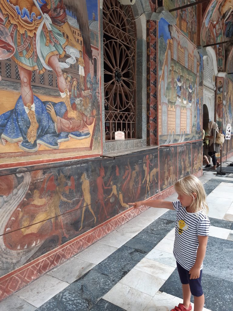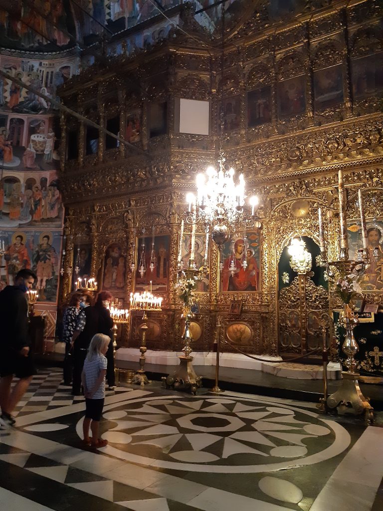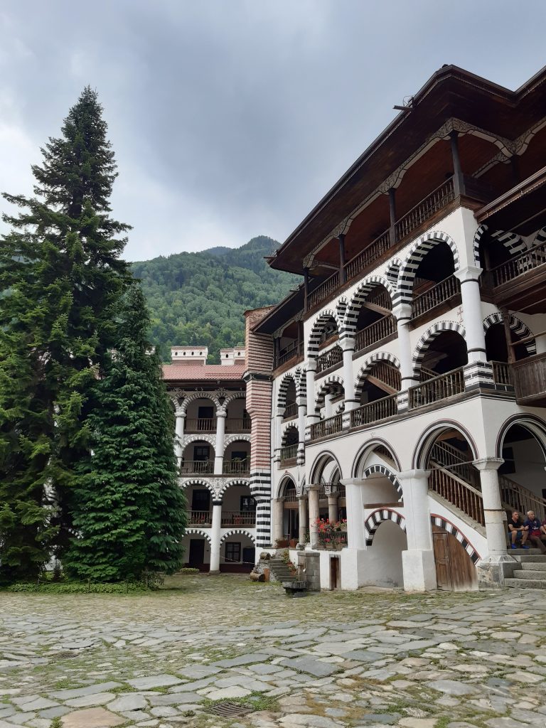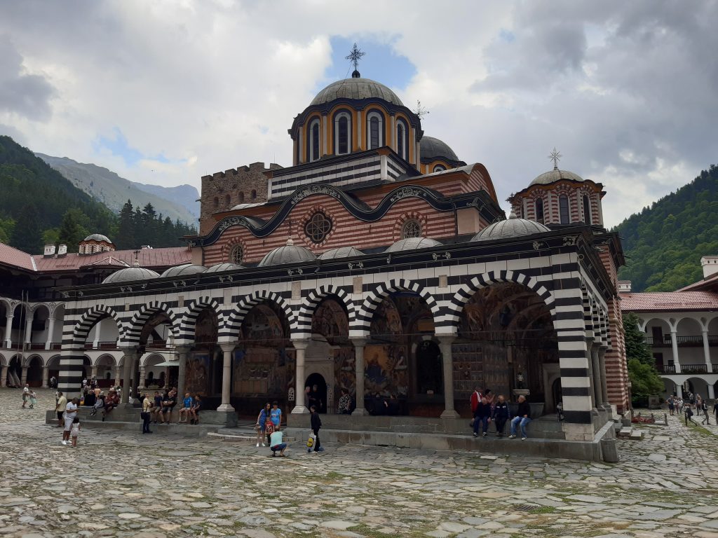 Am Samstag fuhren wir weiter und neben der Erledigung von Notwendigkeiten, wie Einkaufen und Gas auffüllen, besuchten wir das Rila-Kloster, wohl sehr bekannt und vor allem von hoher Bedeutung für die Bulgaren. Es liegt direkt in den Bergen und während unseres Besuches gewitterte es, was dem Ganzen eine besondere Atmosphäre verlieh.