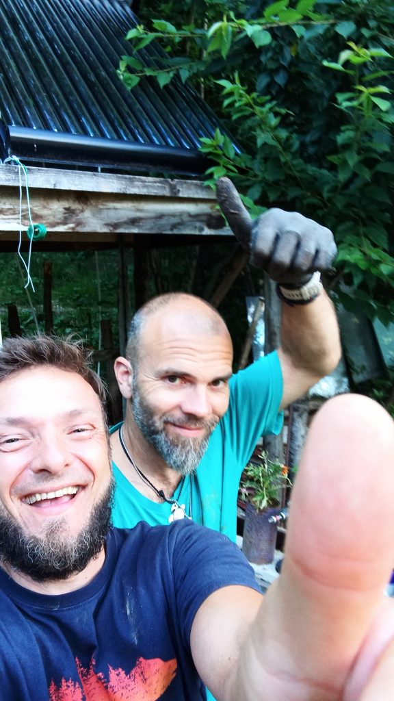 Dabei habe ich mit Bogdan das Gerüst, welches die Warmwasseraufbereitung (Solar) trägt, instandgesetzt. Das Ganze war etwas abenteuerlich, weil die Konstruktion eben schon stark marode war und eigentlich komplett neu aufgebaut werden müsste. Aus Ressourcenmangel musste aber das Bestehende irgendwie instandgesetzt werden, was dann letzendlich mit Wagenheber und Metallstützen gelang.