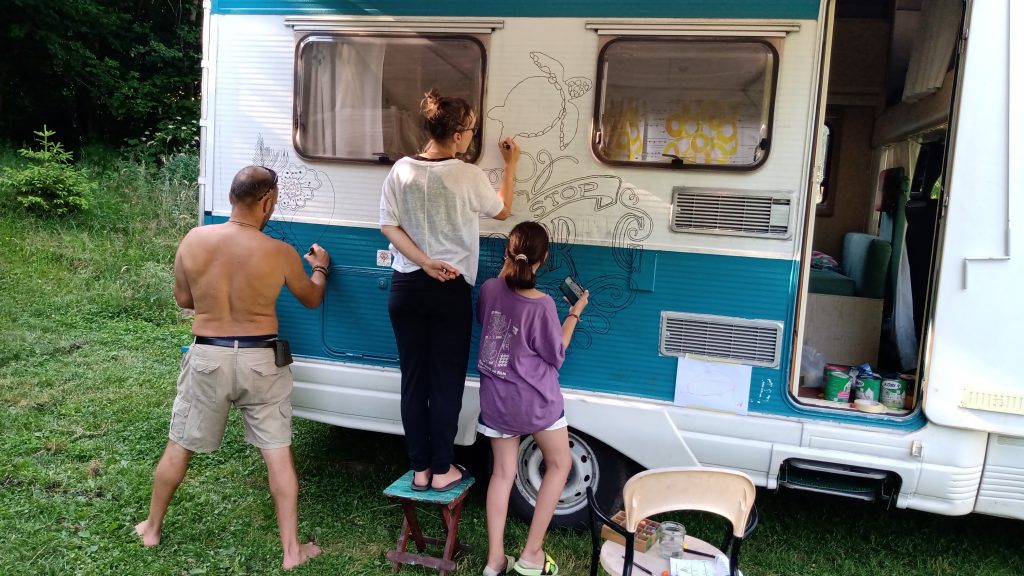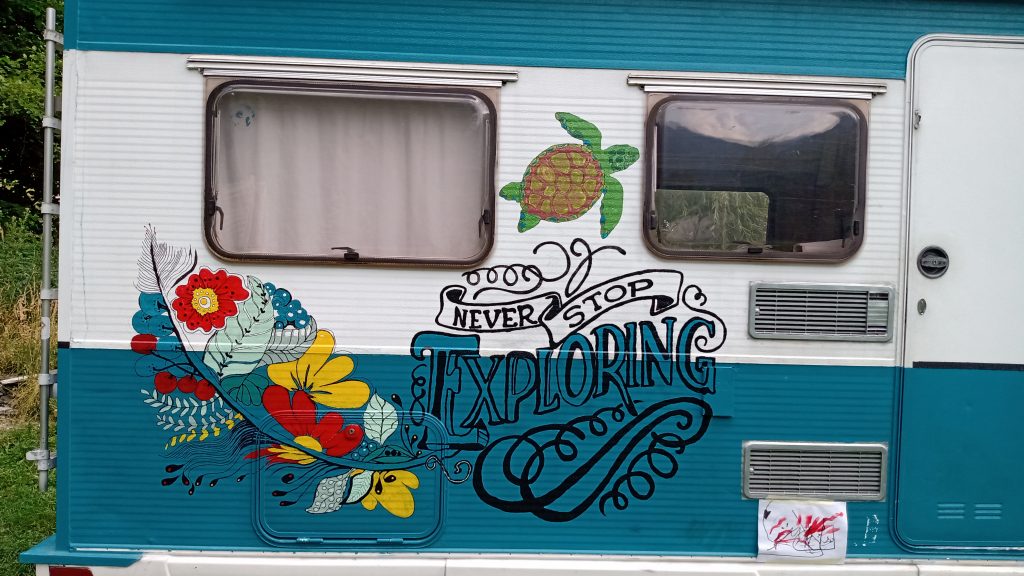In den letzten Tagen haben wir das Wohnmobil der Familie mit bemalt, die nächste Woche damit nach Griechenland fahren wollen. Eine meditative Tätigkeit. Ein Teil von uns fährt nun also immer mit – irgendwie ein schönes Gefühl.