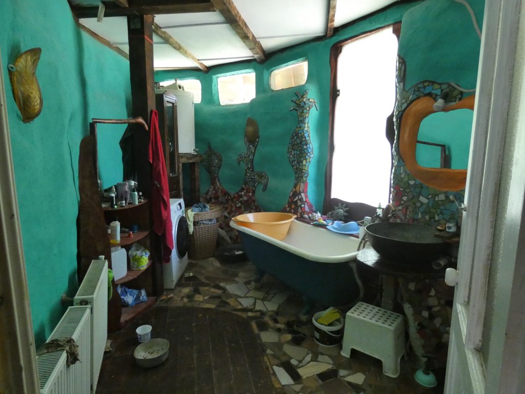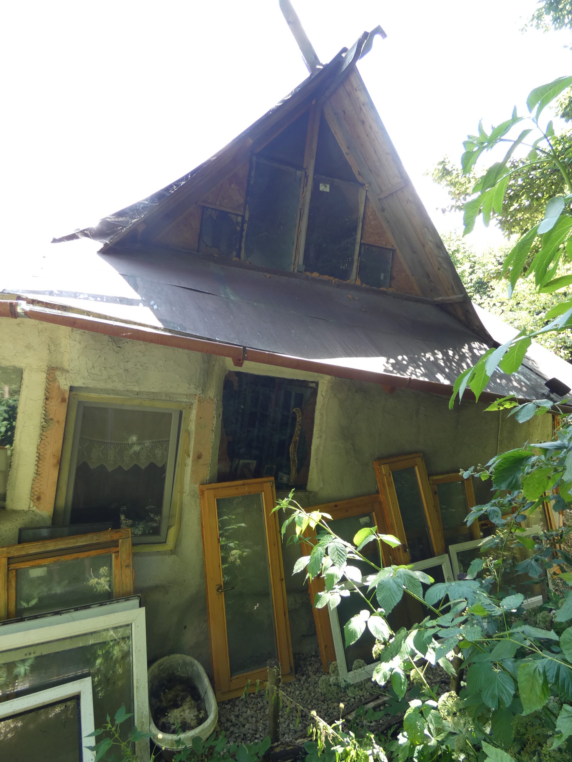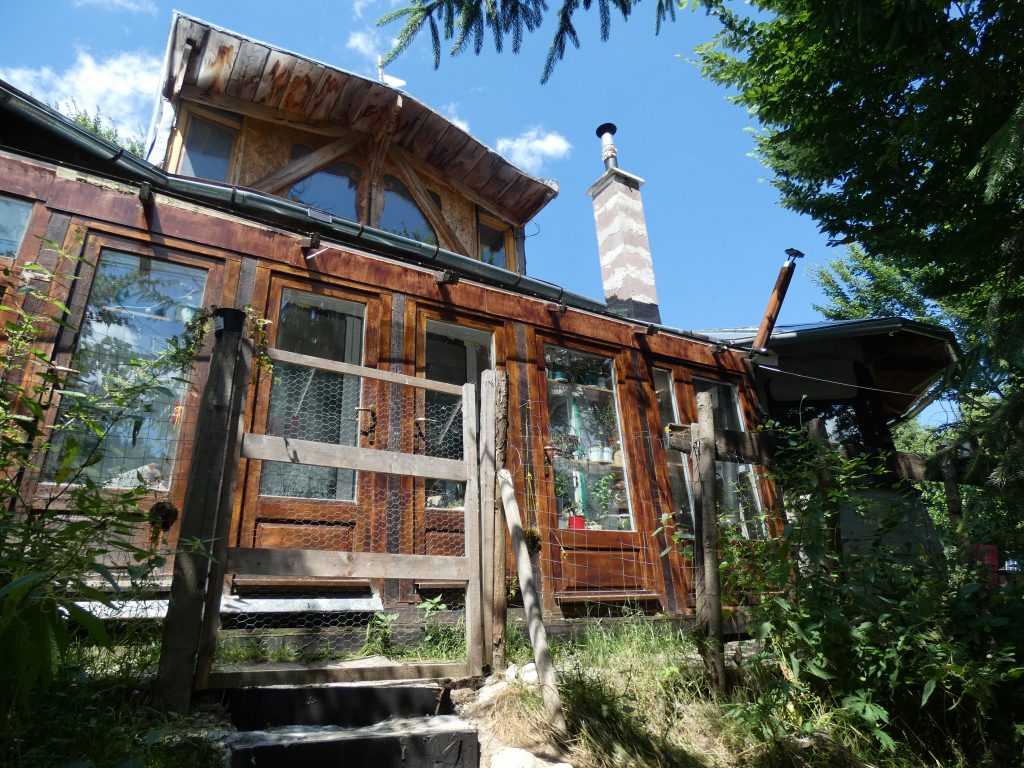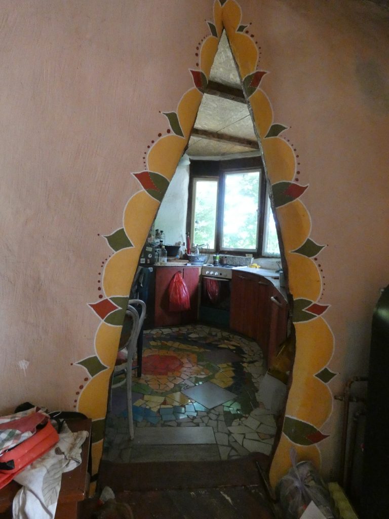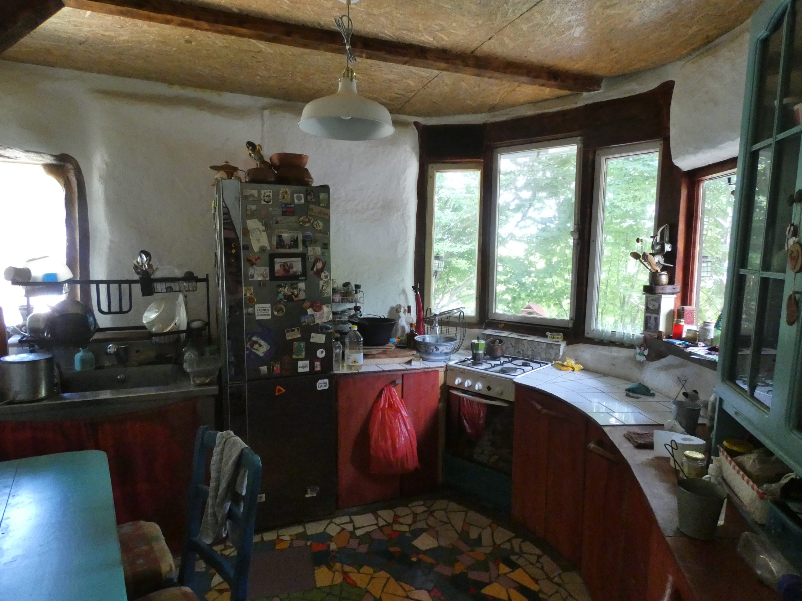 Das Haus ist fast in reiner Eigenleistung gebaut, mit Unterstützung durch Reisende, die ihre Fähigkeiten bestmöglich mit eingebracht haben. Der Elektriker z.B. kam irgendwo aus Afrika :-). Das Haus ist zu großen Teilen aus recycelten bzw. gebrauchten Materialien gebaut. Das heißt vor allem auch, dass hier nichts Standard ist. Jedes Fenster ist anders, jeder Boden, es gibt eigentlich keine geraden Wände – diese sind aus Strohballen und Lehm geformt, das Grundgerüst ist natürlich Holz, das Dach ist aus Blech. Dabei ist das Haus sozusagen organisch gewachsen und immer wieder verbessert worden. Natürlich ist es aber bis heute nicht fertig, das gesamte Obergeschoss wartet noch auf den Ausbau.