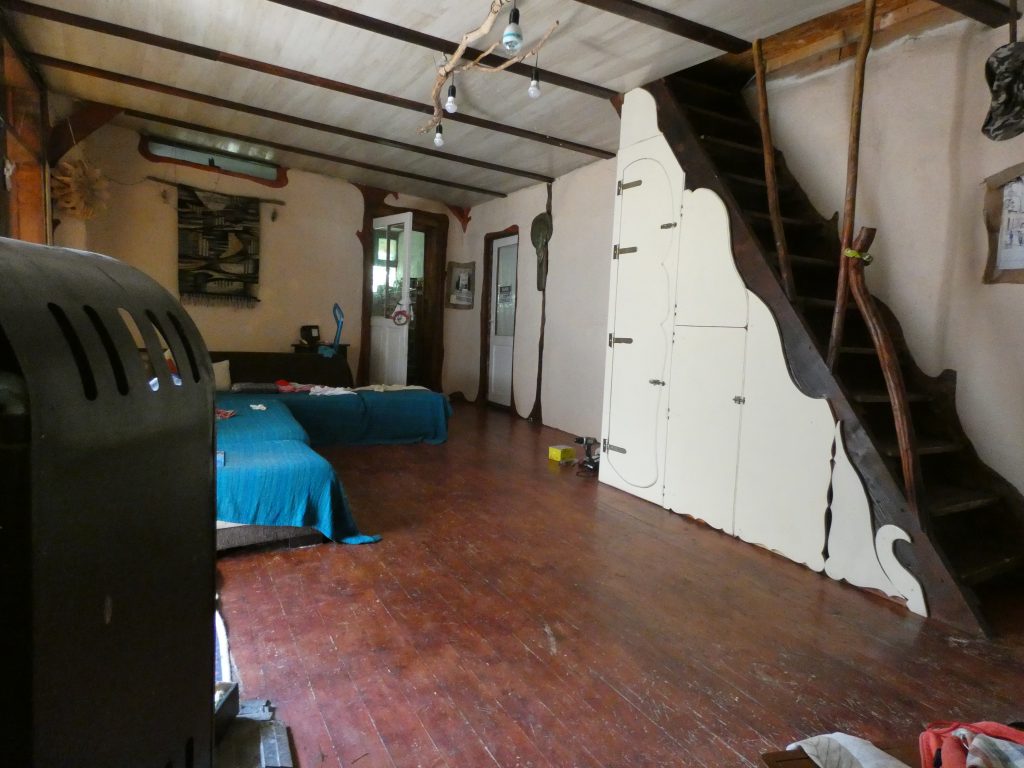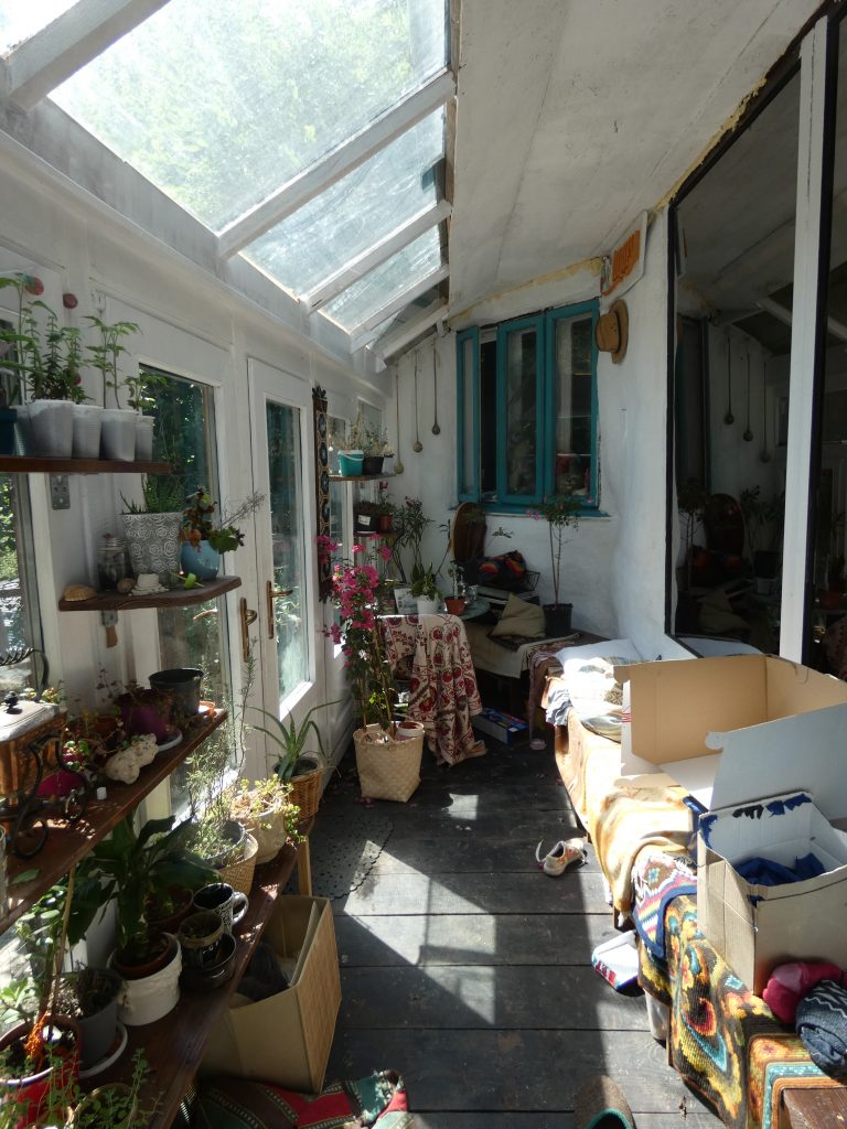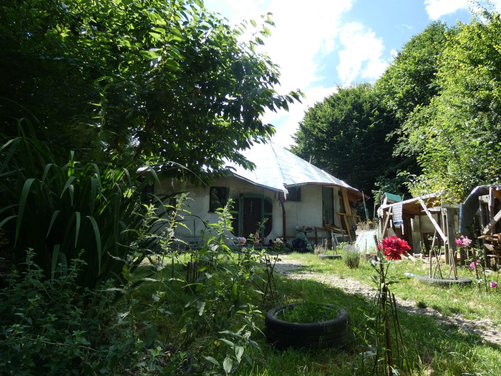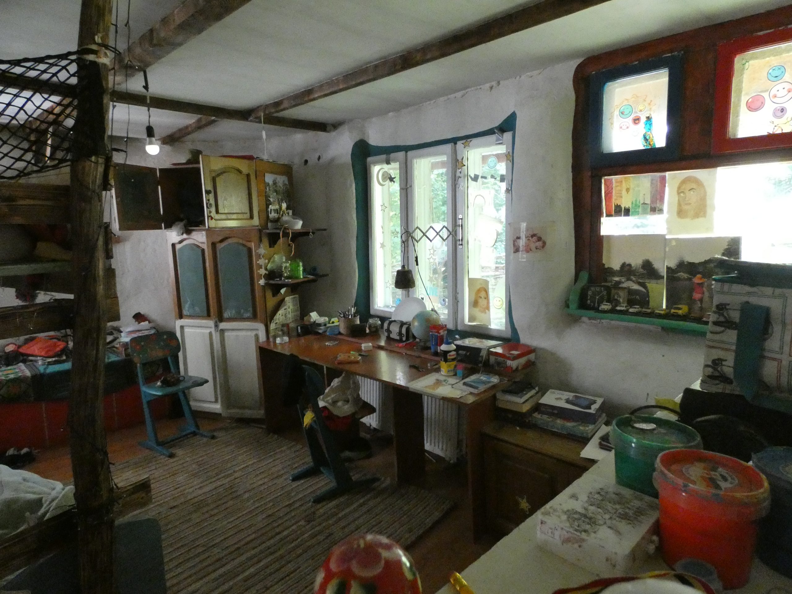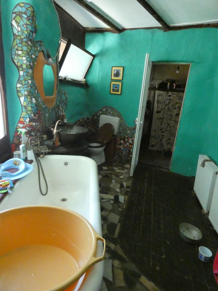 Das Haus ist fast in reiner Eigenleistung gebaut, mit Unterstützung durch Reisende, die ihre Fähigkeiten bestmöglich mit eingebracht haben. Der Elektriker z.B. kam irgendwo aus Afrika :-). Das Haus ist zu großen Teilen aus recycelten bzw. gebrauchten Materialien gebaut. Das heißt vor allem auch, dass hier nichts Standard ist. Jedes Fenster ist anders, jeder Boden, es gibt eigentlich keine geraden Wände – diese sind aus Strohballen und Lehm geformt, das Grundgerüst ist natürlich Holz, das Dach ist aus Blech. Dabei ist das Haus sozusagen organisch gewachsen und immer wieder verbessert worden. Natürlich ist es aber bis heute nicht fertig, das gesamte Obergeschoss wartet noch auf den Ausbau.