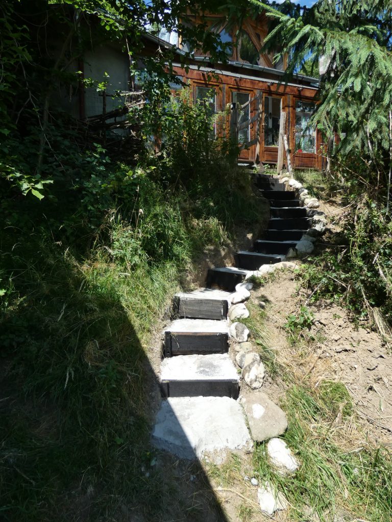 Das nächste Projekt „Stairway to heaven“ war eine Treppe, die die untere Wiese mit den Wohnwagen mit dem auf der oberen Wiese stehenden Wohnhaus verbindet. Einfach in den Hang gehauen, Bretter an die Stufenfront, die Trittflächen mit Steinen belegt und mit Mörtel verfugt – macht sie zumindest aktuell einen stabilen Eindruck.