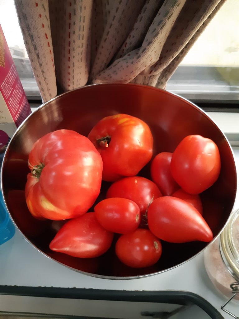 Viele geben gern etwas aus dem eigenen Garten mit, derzeit vor allem Tomaten. So standen in den letzten Tagen auch zwei mal gute gefüllte Stiegen mit großen Tomaten schon früh morgens vor der Tür.