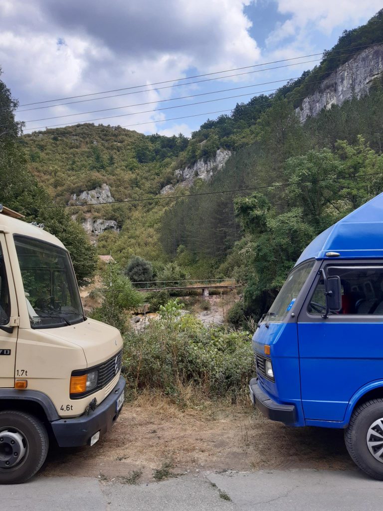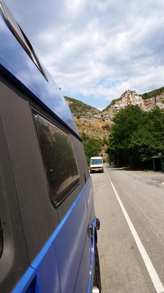 Schon die Fahrt durch diesen Teil des Balkangebirges war ein echter Genuss – unsere zwei Knatterbusse hintereinander durch diese interessante Bergwelt haben uns und etlichen Einheimischen immer wieder ein Lächeln ins Gesicht gezaubert.
