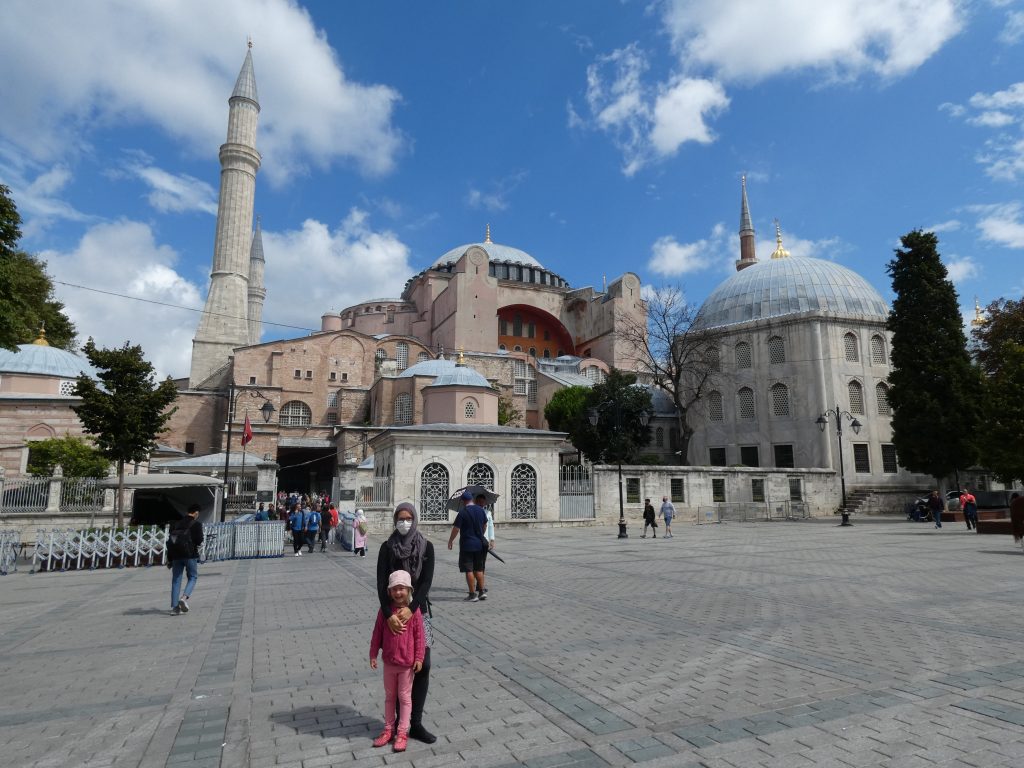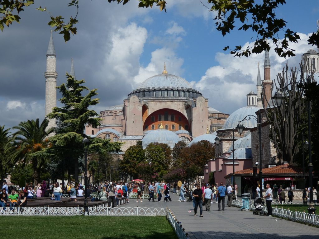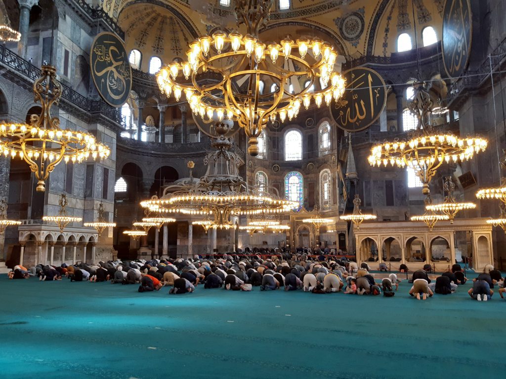 Zum Gebet werden Frauen und Männer aber getrennt. Dies wird fünf mal am Tag zelebriert und regt auch den Körper an, denn zum Gebet gehören etliche Verbeugungen :-). Gleich am ersten Tag nahmen wir an einer Gebetszeit in der Hagia Sophia teil. Ein besonders geschichtsträchtiges und das wohl umstrittendste Gebäude in Istanbul. Denn sie war rund 1.000 Jahre eine Kirche der Christen und teilweise das wichtigste Gotteshaus überhaupt. Bis zum Fall der Stadt 1453 durch die Eroberung durch Sultan Mehmed II., woraufhin die Kirche einige Jahrhunderte zu einer Moschee und ab 1934/35 zu einem Museum wurde. Seit dem 24. Juli 2020 ist sie auf Anordnung von Erdogan wieder eine Moschee.