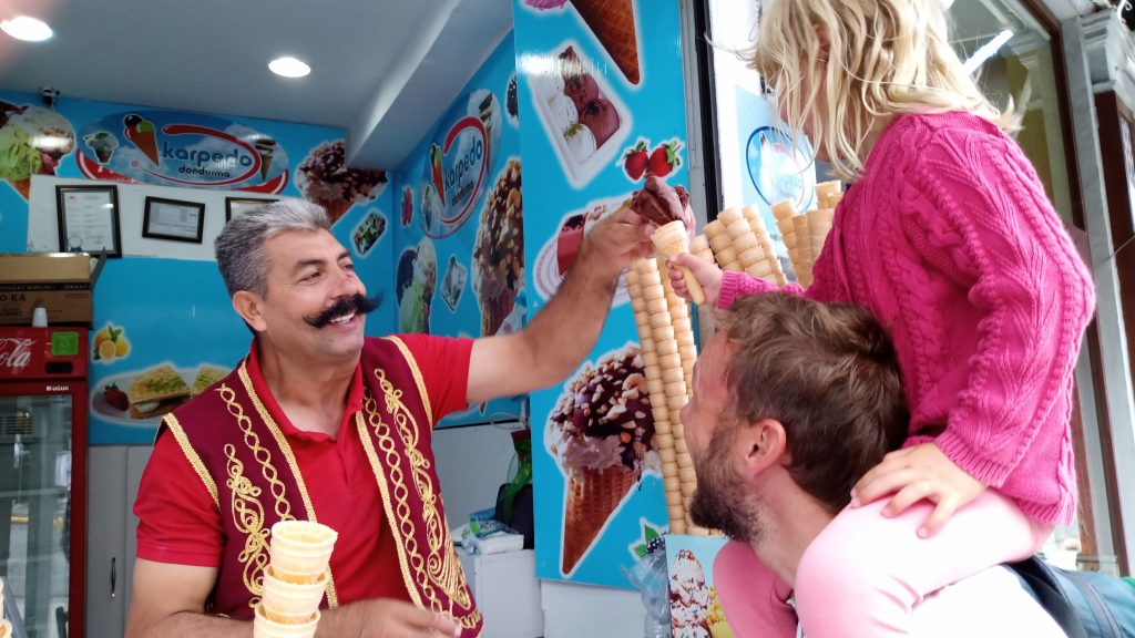 Hannah kann mit allen öffentlichen Verkehrsmitteln noch umsonst fahren. Für den öffentlichen Nahverkehr gibt es die Istanbul-Card für ca. 1,50 €, die man mit Geld auflädt, pro Fahrt werden dann je nach Streckenlänge zwischen 40-90 Cent abgebucht Damit kommt man mit Bus, Metro/Marmaray und Fähre super durch die Stadt. Damit die Karte funktioniert muss man vorher einen sogenannten HES-Code erstellen lassen und dann über ein Webportal mit der Karte verknüpfen. Damit ist man jederzeit nachverfolgbar, da der HES-Code aus Namen, Geburtstag und Reisepassnummer generiert wird. Auch hier wird nachverfolgt was das Zeug hält und Corona liefert auch hier den offiziellen Grund. Schöne neue Welt. Dank zwei jungen Männern aus Turkmenistan, die direkt neben „unserer“ Bahnstation ein Café führen, bekamen wir das mit der Karte und dem Code auch hin 😁.