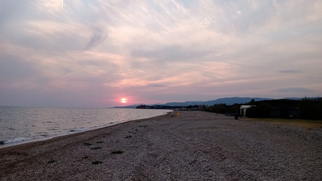 Wir „ziehen durch“ bis zum städtischen Campingplatz in Alexandropoulis und schaffen es tatsächlich noch im Sonnenuntergang ins klare und ruhige Wasser der Ägäis zu hüpfen.