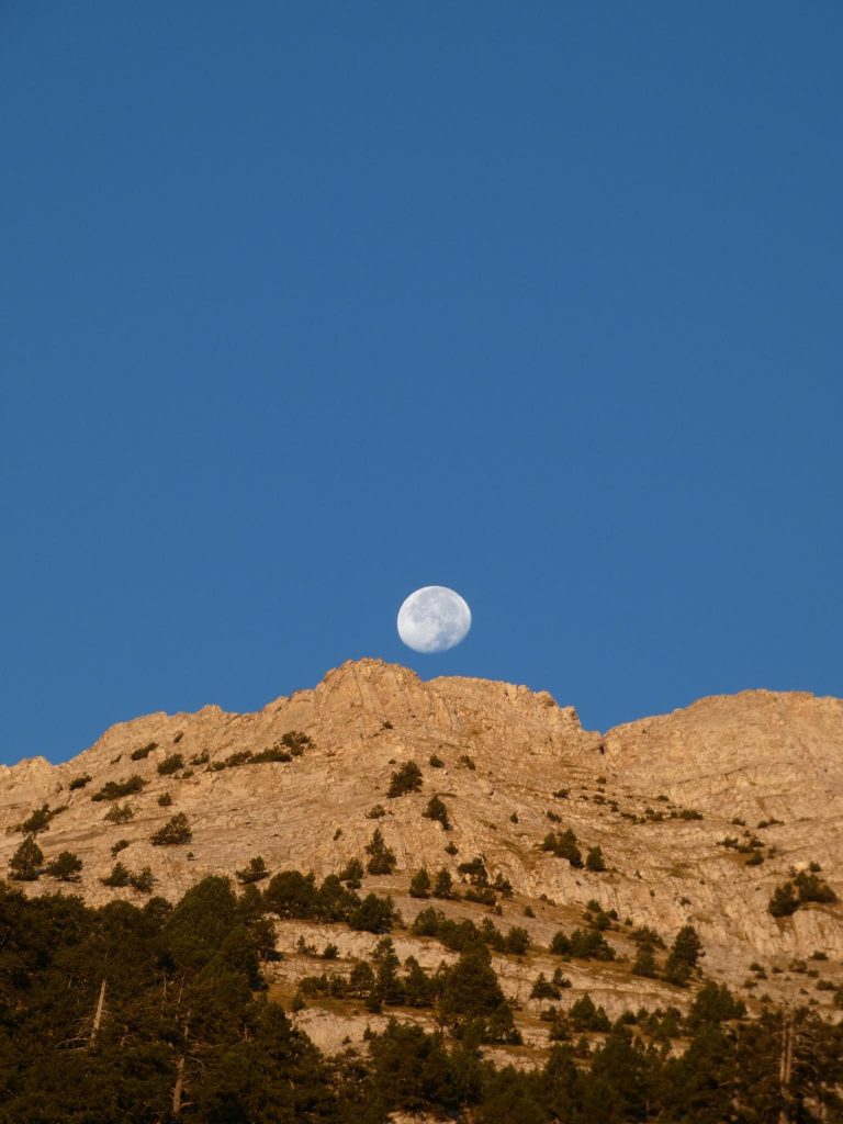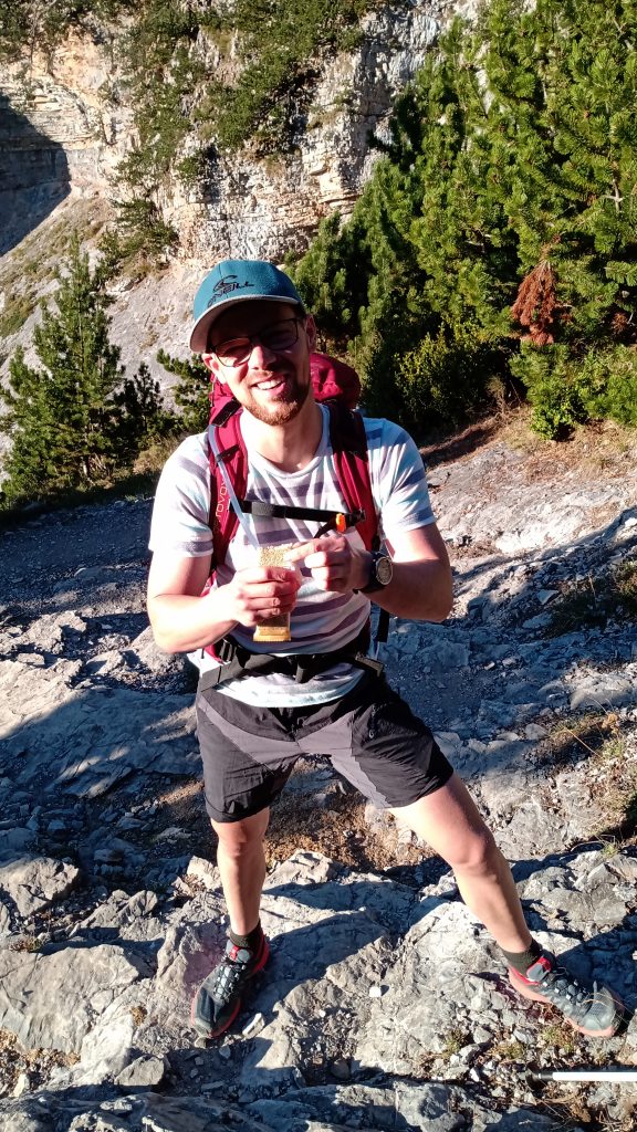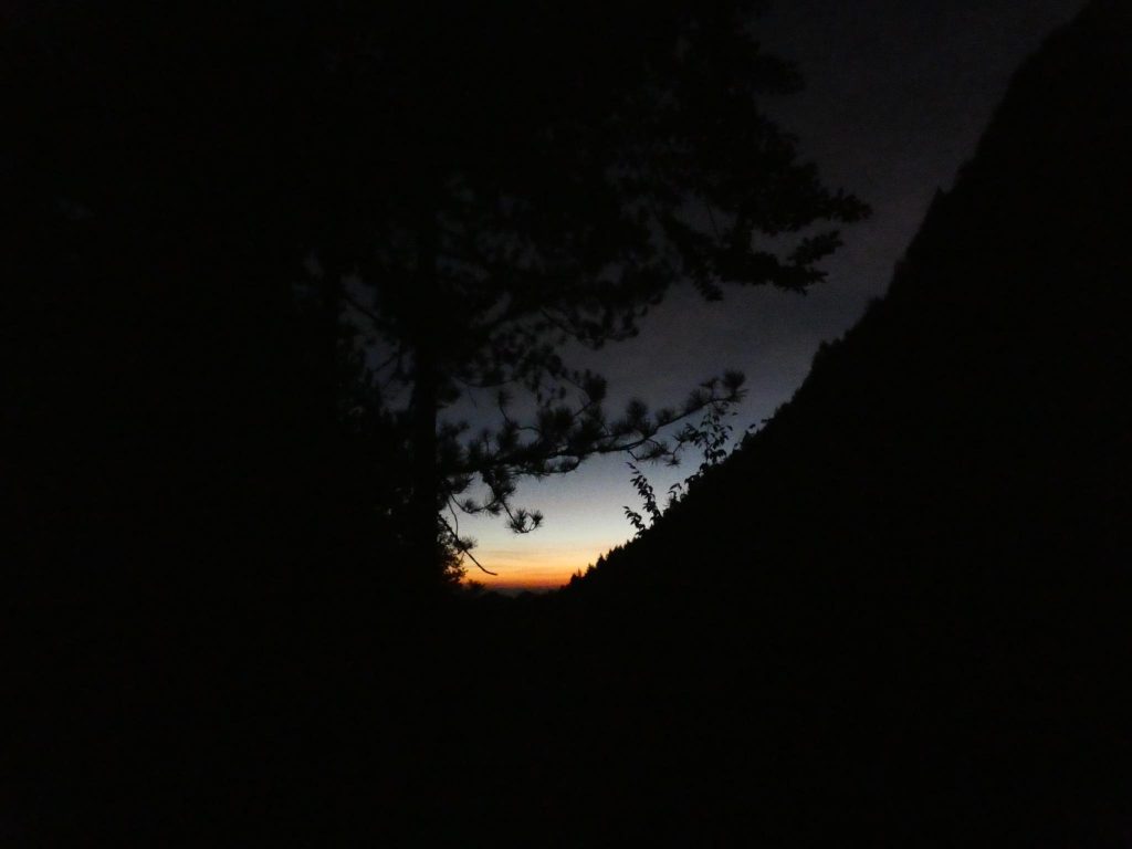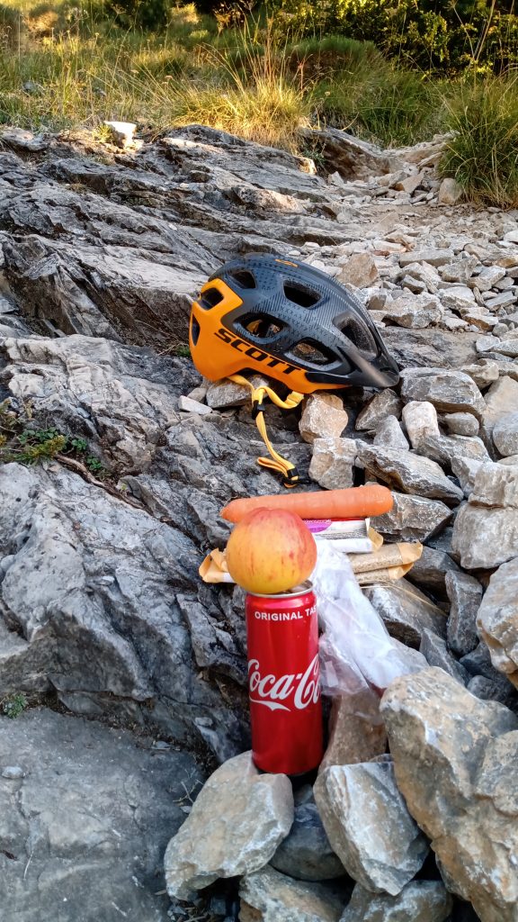 18km verteilt auf 1800 Höhenmeter lagen vor uns. Der Aufstieg war durchaus anspruchsvoll und geprägt von gebirgstypischen wechselhaften Gelände. Es ging durch dichten Hochwald über kieferbewaldete Flächen in immer kargeres, von Granitgeröll dominiertes Gelände. Der Anstieg schwankte zwischen 5 – 40°. Gegen 07:30 Uhr konnten wir dann die Stirnlampen ablegen und wanderten teilweise in praller Sonne. Am ersten Zwischenstopp zogen wir dann auch die leichteren Wandersachen an und ich fotografierte nochmals unsere Verpflegung (denn es drängte sich mir der Eindruck auf: „ist ganz schön viel…).