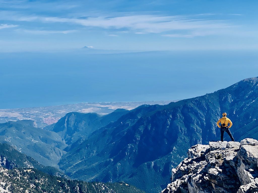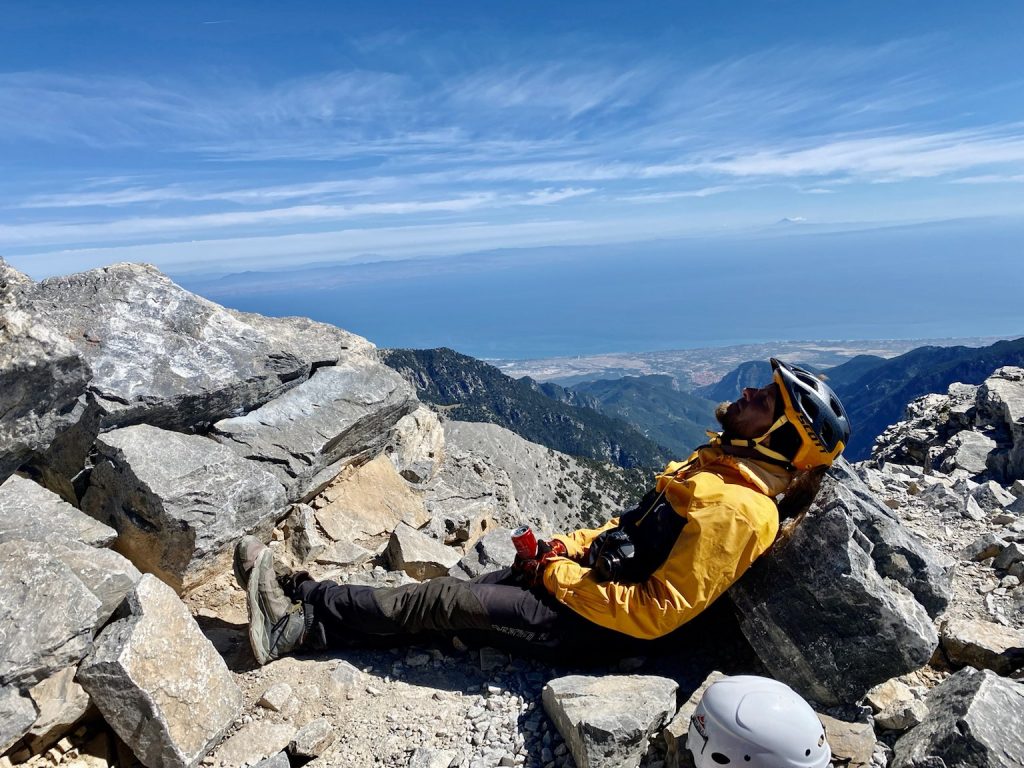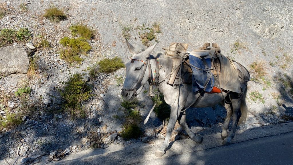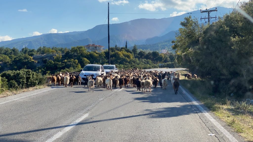 Das Team war schnell zusammengestellt: Tony, Orbi & Luigi gehen auf Tour. Und schon ging es los, am Donnerstag den 23.09., knatterten wir mit Luigi in knapp drei Stunden und mit passender Mugge im Ohr (die Klassiker: „Rückenwind“, „Susanne zur Freiheit“, „Lass die Sonne rein“, „Krieger“ und smoth Techno von Dominik Eulenberg) bis zu unserem „Basislager“, dem Parkplatz Priónia unterhalb des zu erklimmenden Bergmassivs. Schon die Fahrt bergauf zum Parkplatz war ein Highlight: Ziegen, Esel und immer wieder ein atemberaubender Blick, auf die schnell kleiner werdende Küste, ließen unsere Herzen höher schlagen. Es ging von 0 auf ca. 1000 Meter in wenigen Minuten.