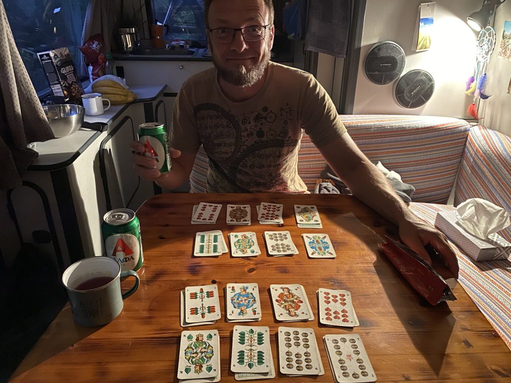 Der Abend verlief gemütlich mit Nudeln, Alpha-Bier, Tee und Offiziers-Skat. Einzig die knurrenden und bellenden Hunde rund um unseren Bus beunruhigten etwas. Das wird uns noch begleiten… 21 Uhr war Feierabend, der Wecker war auf 05:00 Uhr morgens gestellt.