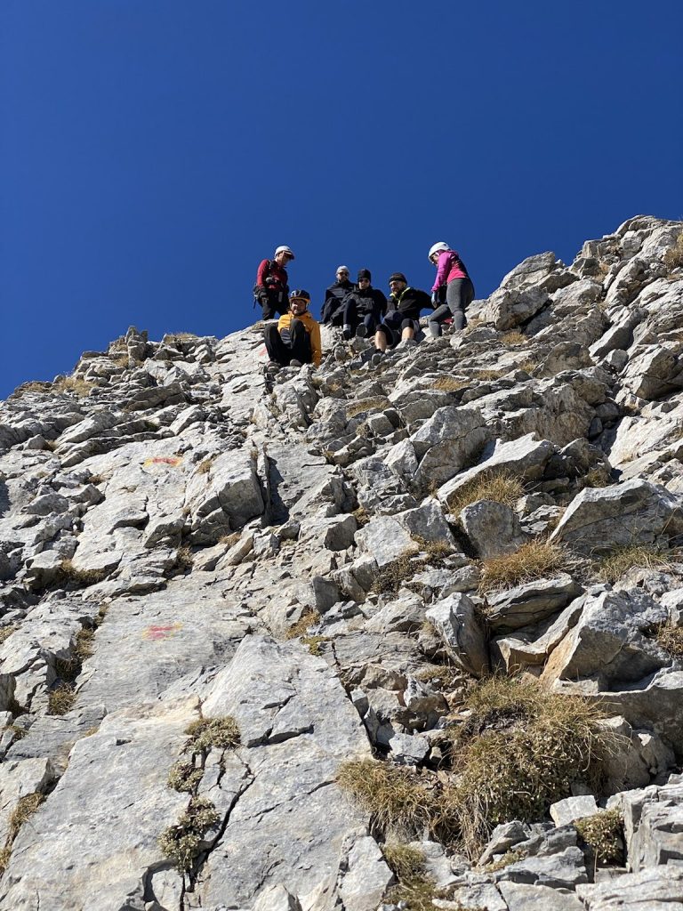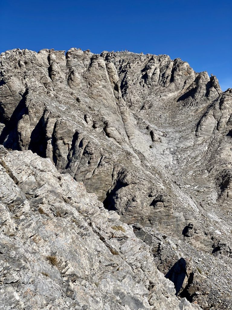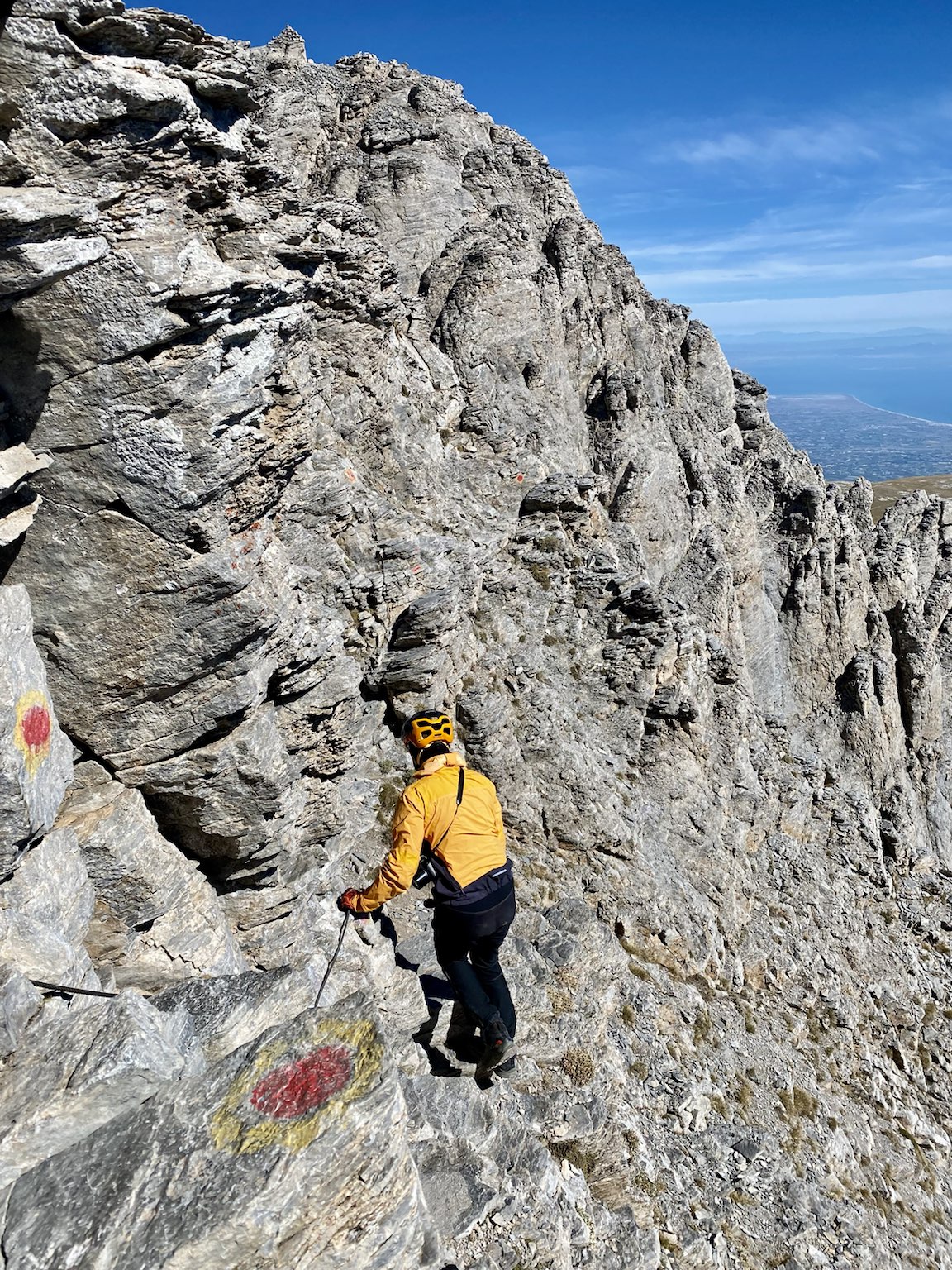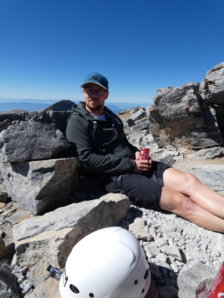Es war mittlerweile 12:00 Uhr, sechs Stunden Aufstieg lagen hinter uns und das Beste noch vor uns. Wir waren auf dem Bergmassiv mit den Berggipfeln Skolia, Skala und Mytikas angekommen. Ohne Frage, wir wollten den höchsten, „Mytikas“ mit 2918 Metern, erreichen. Kurz vor dem Start noch ein Schock: die sorgsam aufgesparten Knacker in unserem Verpflegungspaket waren verschwunden! Ich hatte sie wohl beim Umziehen und Fotografieren ausgepackt und dann liegen lassen. Voll doof.
