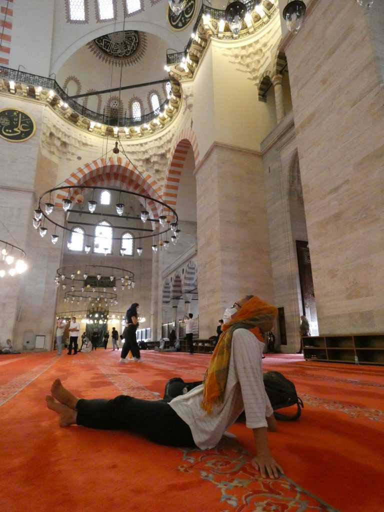 Rein kommen Mann und Frau nur barfuß und in langer Kleidung, die Frauen brauchen zudem ein Kopftuch. Innen geht’s entspannt zu. Der Fußboden ist immer mit Teppich ausgelegt und lädt zum gemütlichen Lümmeln ein. Also ein Ort der Entspannung und des Gebets.