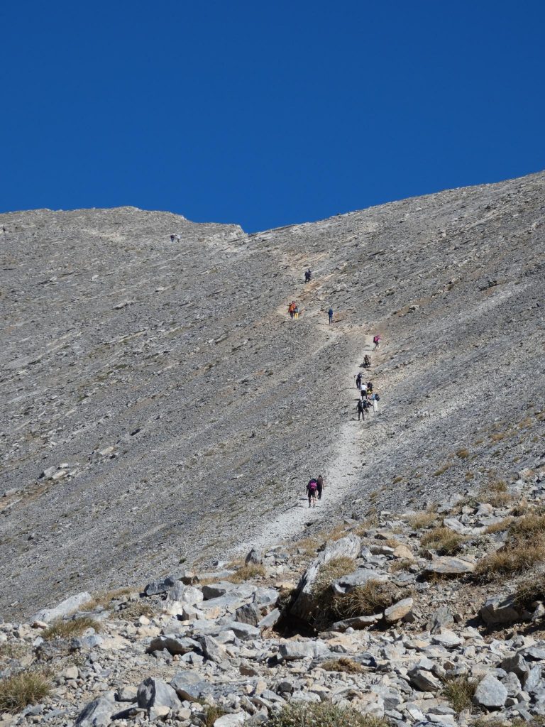 Der Aufstieg zog sich bis zu einer netten Zwischenstation „Refugees“ hin und dort verließ uns auch Hera, die uns bisher treu begleitet hatte. Schließlich hatten wir die letzten 500 Höhenmeter bei 40° Steigung in praller Sonne vor uns und nach ca. 1h auch endlich hinter uns. Bereits hier war klar: der Abstieg wird weh tun.